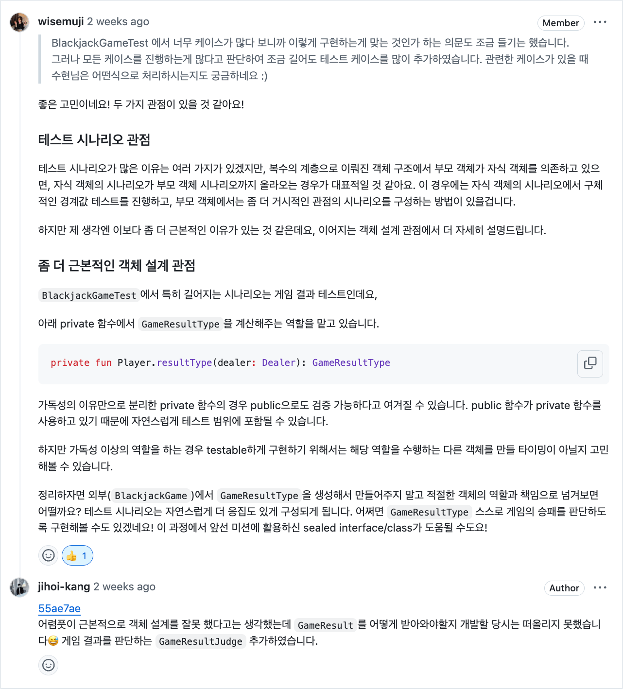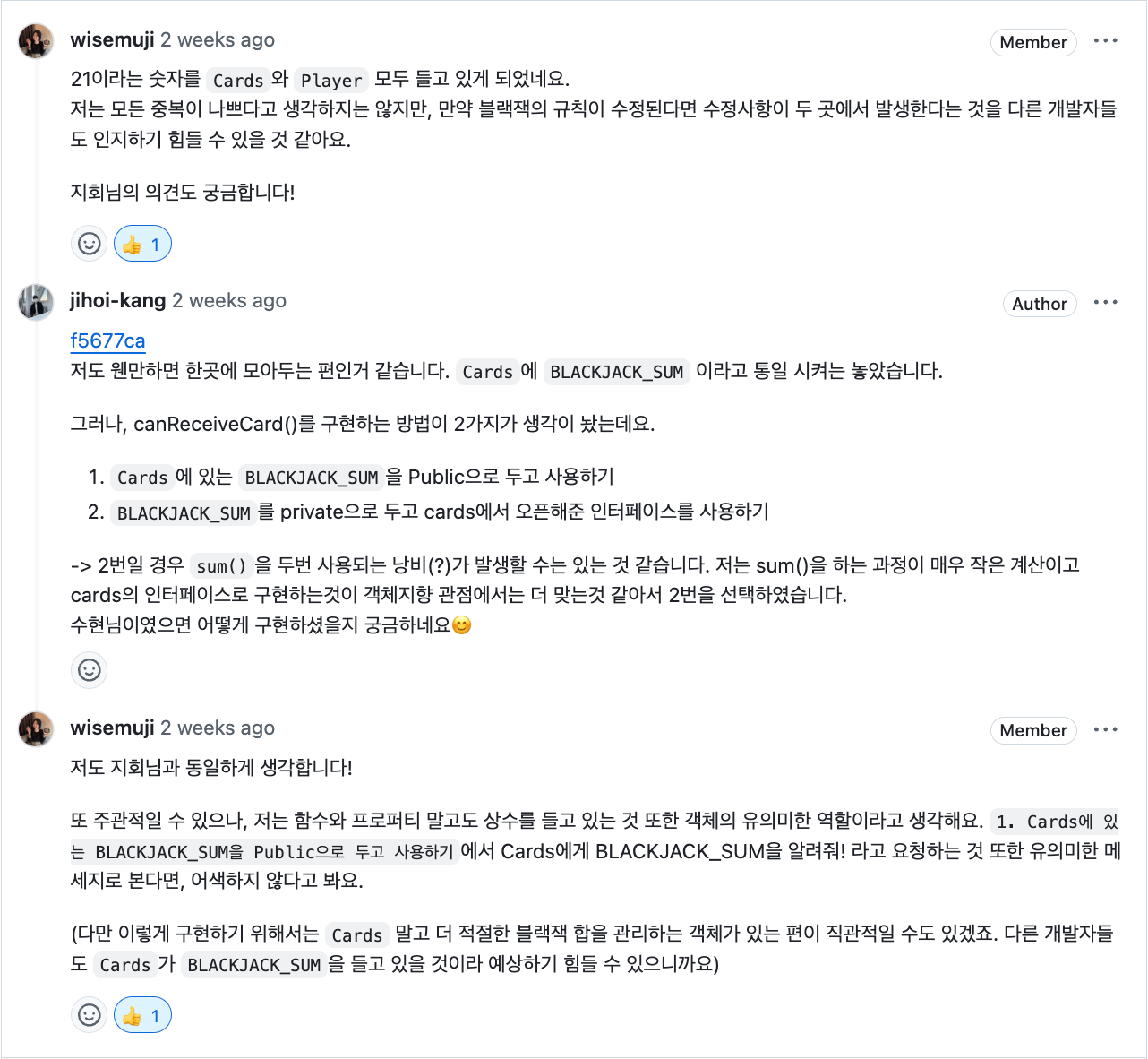 변수 중복에 대한 부분과 객체의 인터페이스 관점에 대해 고민해볼 거리를 던져주셔서 의견을 나누었다.
